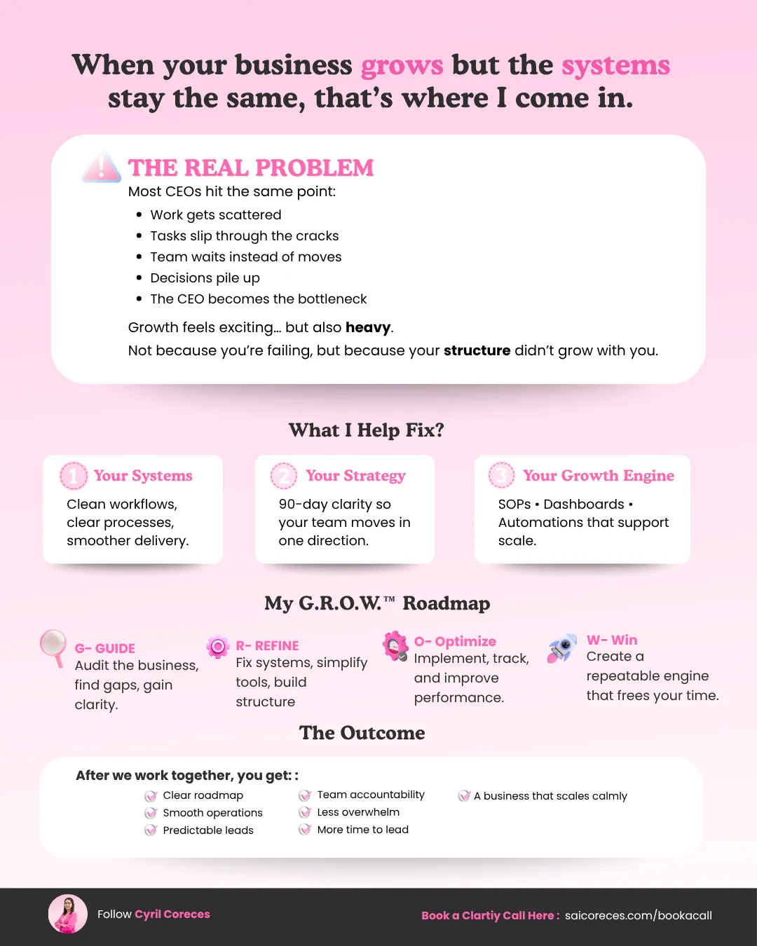 I help visionary CEOs and Founders simplify their operations, optimize their systems, and build a predictable growth engine — using the G.R.O.W.™ Framework.